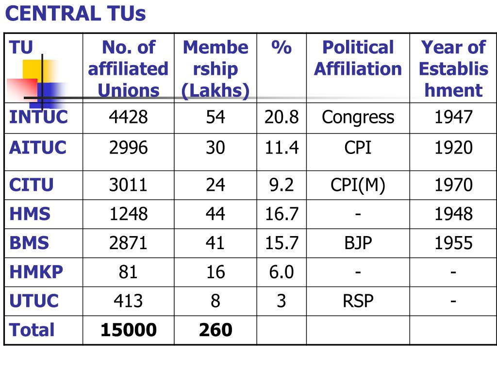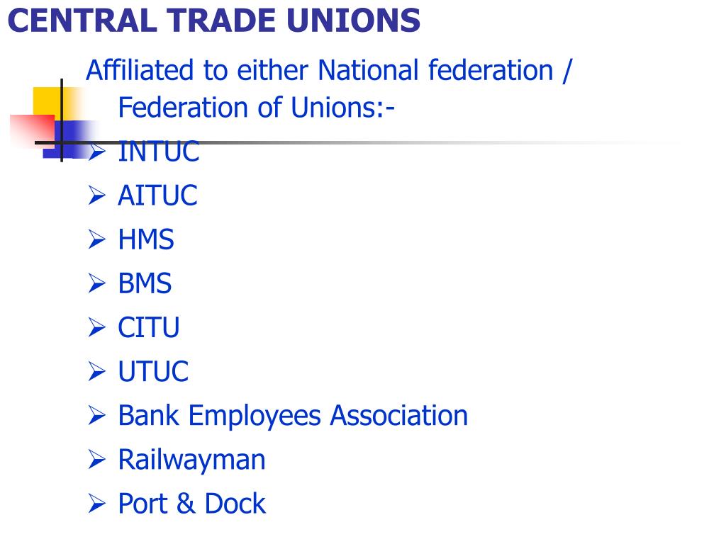 CENTRAL TRADE UNIONS Affiliated to either National federation / Federation of Unions:- • INTUC • AITUC • HMS • BMS • CITU • UTUC • Bank Employees Association • Railwayman • Port & Dock
