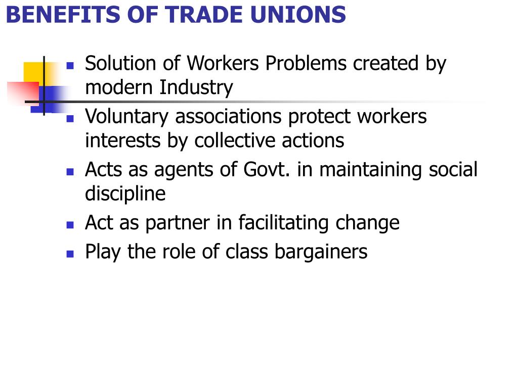 BENEFITS OF TRADE UNIONS • Solution of Workers Problems created by modern Industry • Voluntary associations protect workers interests by collective actions • Acts as agents of Govt. in maintaining social discipline • Act as partner in facilitating change • Play the role of class bargainers