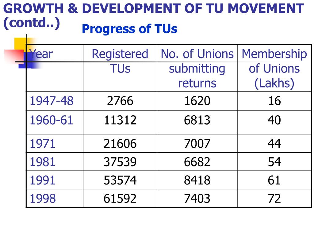 GROWTH & DEVELOPMENT OF TU MOVEMENT (contd..) Progress of TUs
