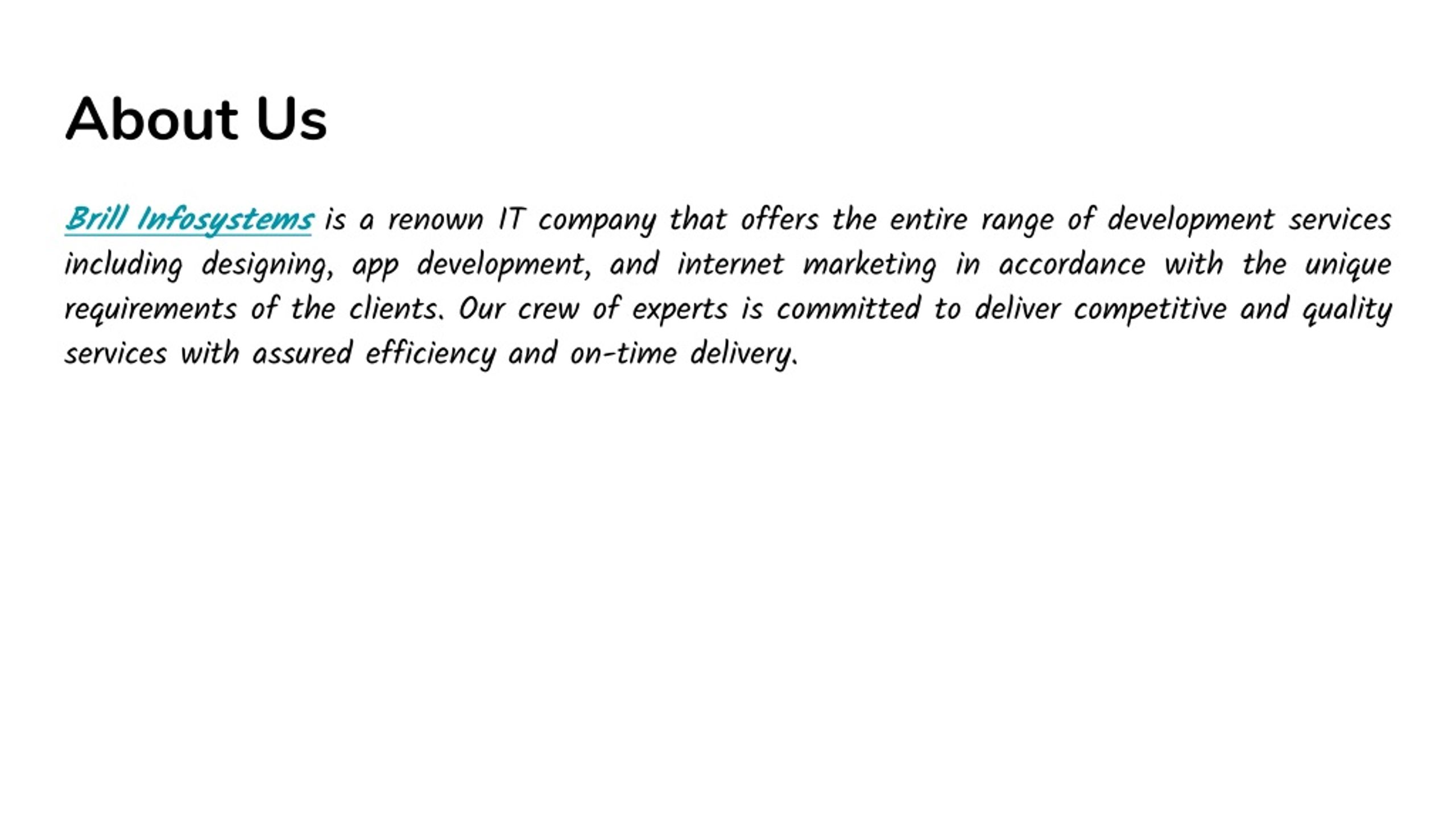 About Us Brill Infosystems is a renown IT company that offers the entire range of development services including designing, app development, and internet marketing in accordance with the unique requirements of the clients. Our crew of experts is committed to deliver competitive and quality services with assured efficiency and on-time delivery.