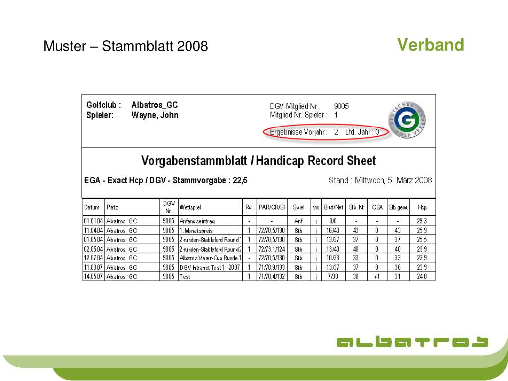 Verband DGV Spieler-ID Der deutsche Golfverband führt zum 1.1.2008 eine DGV-Spieler-ID ein. Diese Spieler-ID wird nach Einspielen des Updates mit einem Servicedialog automatisch vom Albatros-System beim DGV abgefragt und in Albatros hinterlegt. Die DGV-Spieler-ID wird den Spieler auch bei zukünftigen Clubwechseln begleiten und ermöglicht so eine Datenübernahme bei Stammblättern und verhindert die heute noch bestehenden Dubletten im DGV-Intranet. Anpassungen bei der Schnittstelle zum DGV-Intranet Die Schnittstelle zum DGV-Intranet wird in 2008 komplett auf XML umgestellt. Da Albatros diesen Schritt als einziger Anbieter am Markt bereits für 2007 durchgeführt hat entstehen hier nur marginale Anpassungen.