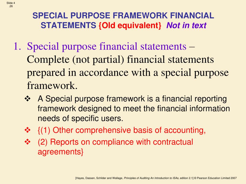 SPECIAL PURPOSE FRAMEWORK FINANCIAL STATEMENTS {Old equivalent} Not in text • Special purpose financial statements – Complete (not partial) financial statements prepared in accordance with a special purpose framework. • A Special purpose framework is a financial reporting framework designed to meet the financial information needs of specific users. • {(1) Other comprehensive basis of accounting, • (2) Reports on compliance with contractual agreements}