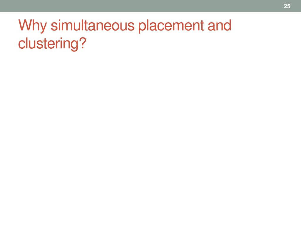 More freedom of changing to change a circuit structure but fast and accurate estimation of wirelength, timing and routability are not available in clustering stage In placement stage due to the fixed circuit structure, simultaneous optimization of wirelength, timing and routability are possible. Sub-optimal place and route result!!!! Why simultaneous placement and clustering?