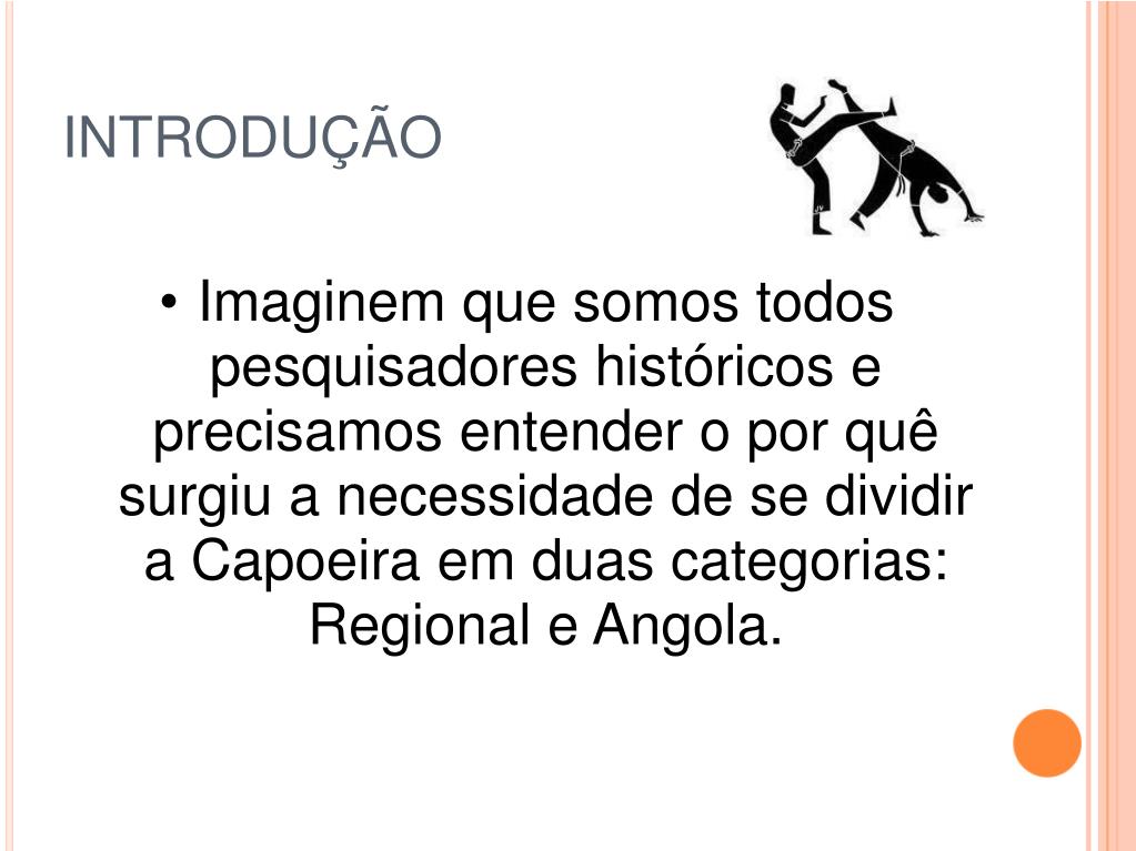 INTRODUÇÃO • Imaginem que somos todos pesquisadores históricos e precisamos entender o por quê surgiu a necessidade de se dividir a Capoeira em duas categorias: Regional e Angola.