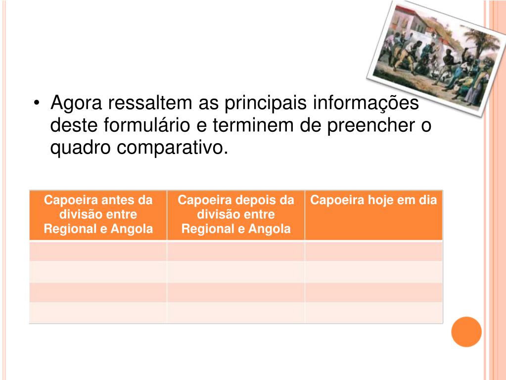 Agora ressaltem as principais informações deste formulário e terminem de preencher o quadro comparativo. Capoeira antes da divisão entre Regional e Angola Capoeira depois da divisão entre Regional e Angola Capoeira hoje em dia