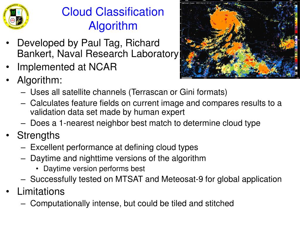 Cloud Classification Algorithm • Developed by Paul Tag, Richard Bankert, Naval Research Laboratory • Implemented at NCAR • Algorithm: • Uses all satellite channels (Terrascan or Gini formats) • Calculates feature fields on current image and compares results to a validation data set made by human expert • Does a 1-nearest neighbor best match to determine cloud type • Strengths • Excellent performance at defining cloud types • Daytime and nighttime versions of the algorithm • Daytime version performs best • Successfully tested on MTSAT and Meteosat-9 for global application • Limitations • Computationally intense, but could be tiled and stitched