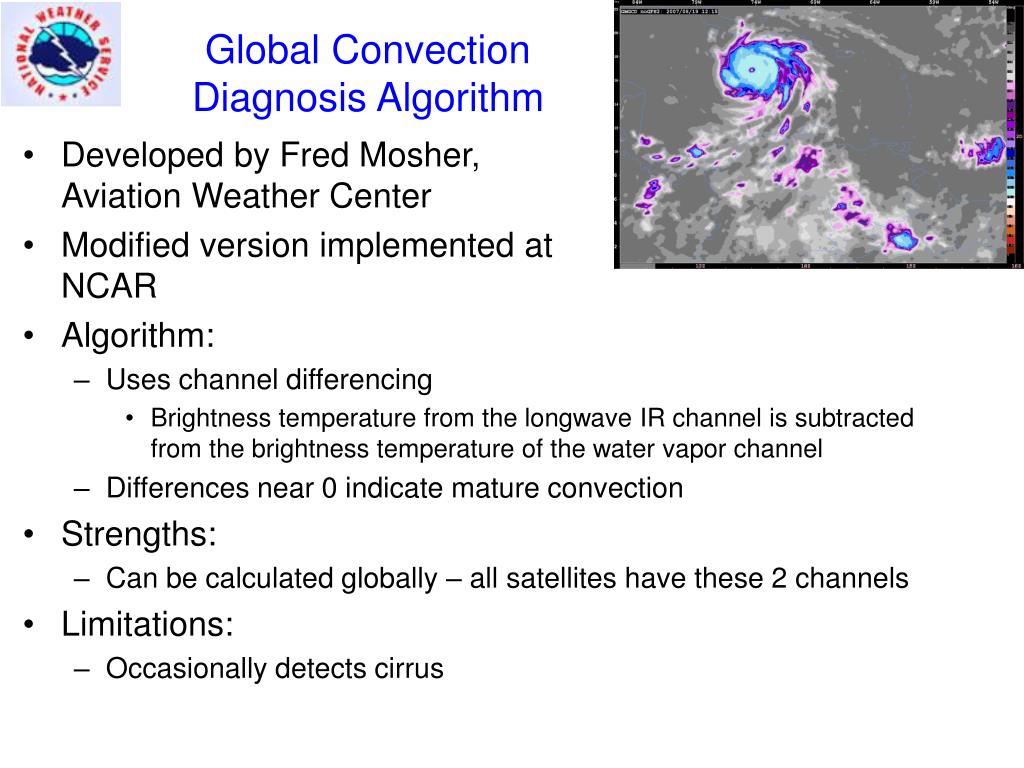 Global Convection Diagnosis Algorithm • Developed by Fred Mosher, Aviation Weather Center • Modified version implemented at NCAR • Algorithm: • Uses channel differencing • Brightness temperature from the longwave IR channel is subtracted from the brightness temperature of the water vapor channel • Differences near 0 indicate mature convection • Strengths: • Can be calculated globally – all satellites have these 2 channels • Limitations: • Occasionally detects cirrus