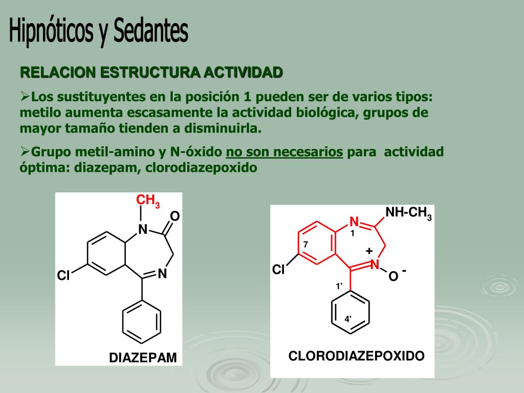 Hipnóticos y Sedantes RELACION ESTRUCTURA ACTIVIDAD • Los sustituyentes en la posición 1 pueden ser de varios tipos: metilo aumenta escasamente la actividad biológica, grupos de mayor tamaño tienden a disminuirla. • Grupo metil-amino y N-óxido no son necesarios para actividad óptima: diazepam, clorodiazepoxido