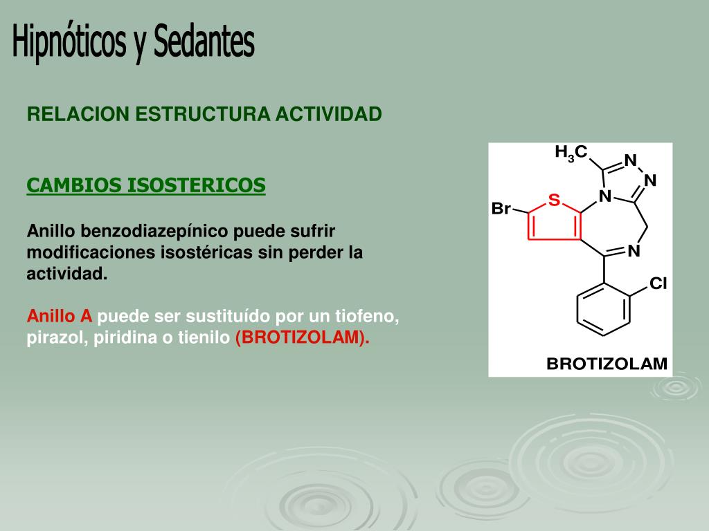 Hipnóticos y Sedantes RELACION ESTRUCTURA ACTIVIDAD CAMBIOS ISOSTERICOS Anillo benzodiazepínico puede sufrir modificaciones isostéricas sin perder la actividad. Anillo A puede ser sustituído por un tiofeno, pirazol, piridina o tienilo (BROTIZOLAM).