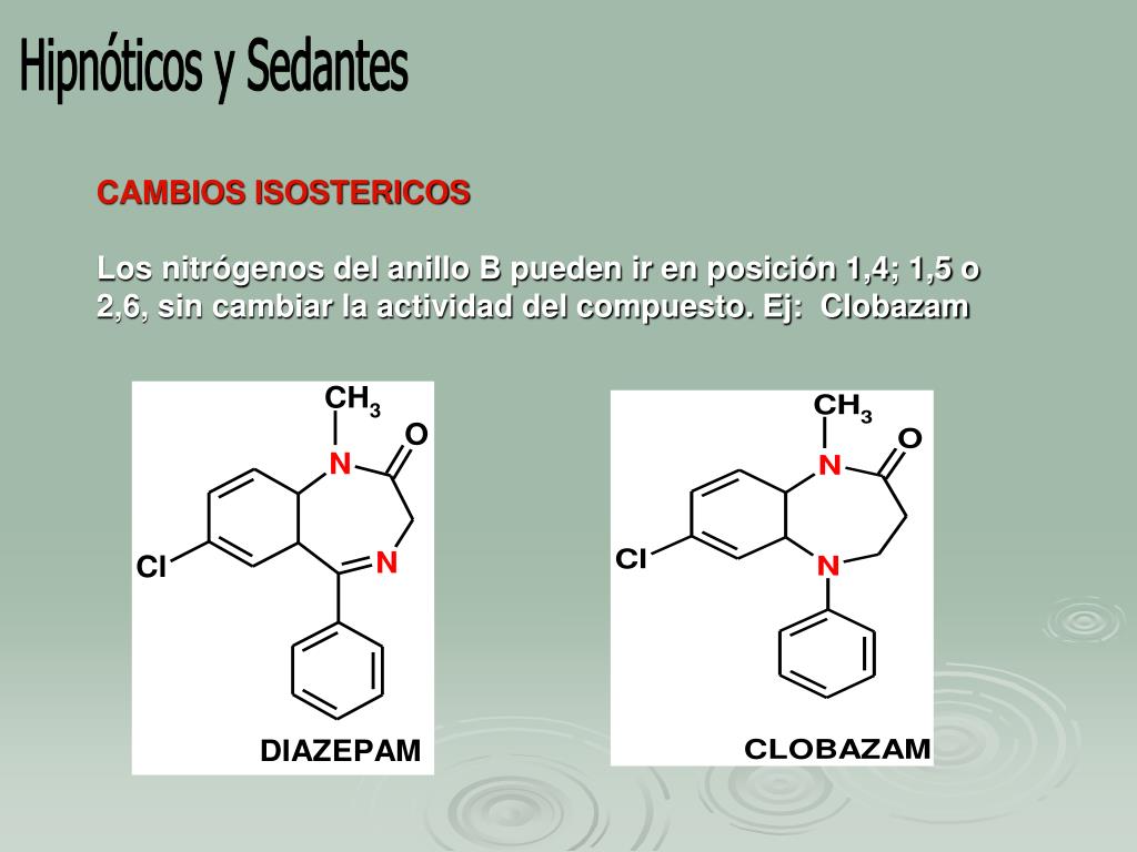 Hipnóticos y Sedantes CAMBIOS ISOSTERICOS Los nitrógenos del anillo B pueden ir en posición 1,4; 1,5 o 2,6, sin cambiar la actividad del compuesto. Ej: Clobazam