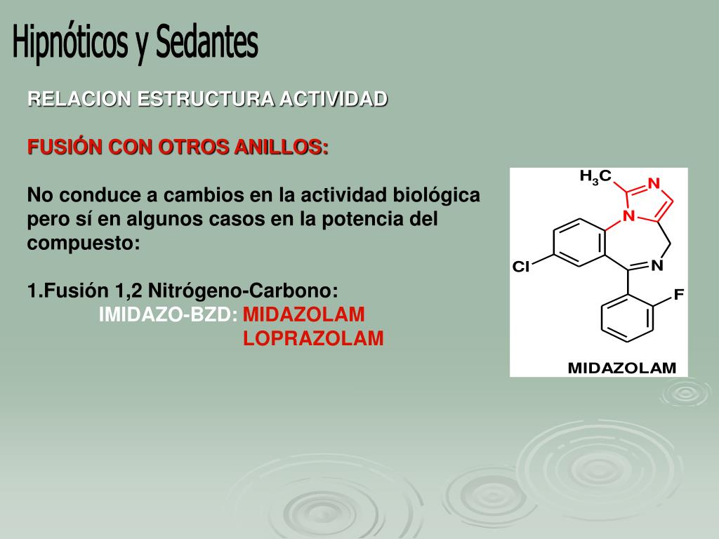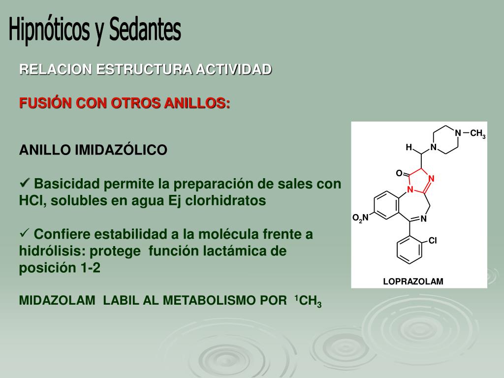 Hipnóticos y Sedantes • RELACION ESTRUCTURA ACTIVIDAD • FUSIÓN CON OTROS ANILLOS: • ANILLO IMIDAZÓLICO • Basicidad permite la preparación de sales con HCl, solubles en agua Ej clorhidratos • Confiere estabilidad a la molécula frente a hidrólisis: protege función lactámica de posición 1-2 MIDAZOLAM LABIL AL METABOLISMO POR 1CH3