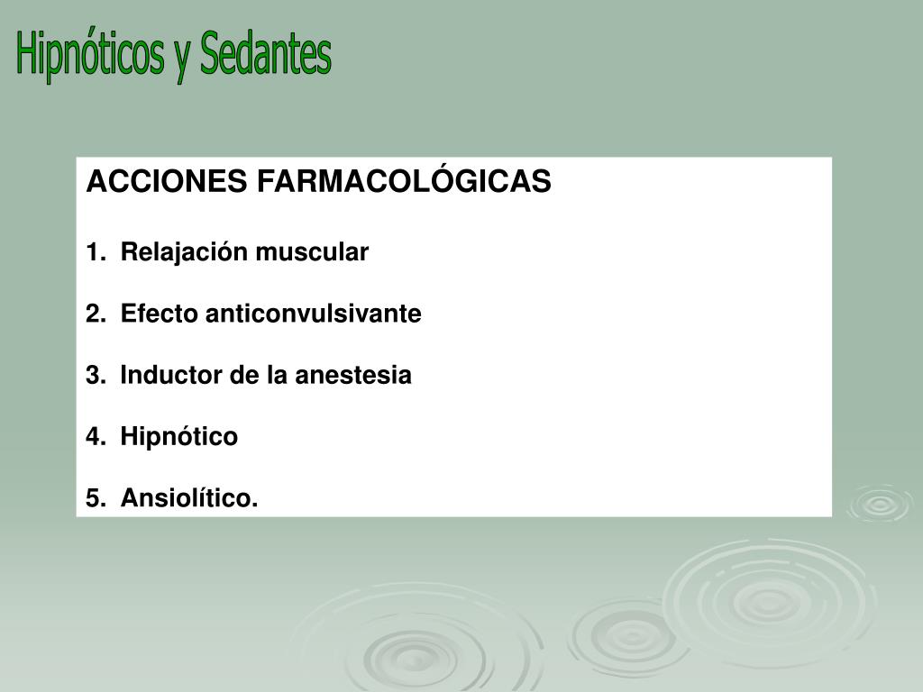 Hipnóticos y Sedantes • ACCIONES FARMACOLÓGICAS • Relajación muscular • Efecto anticonvulsivante • Inductor de la anestesia • Hipnótico • Ansiolítico.