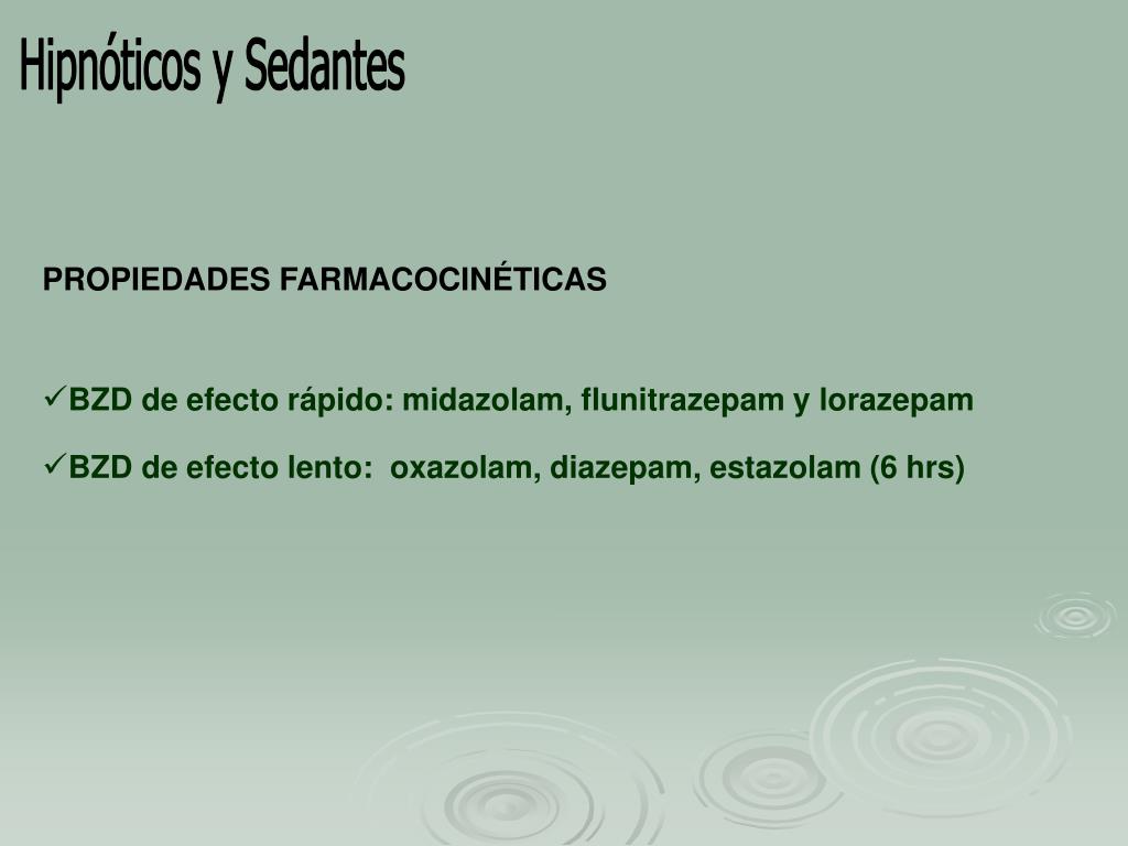 Hipnóticos y Sedantes • PROPIEDADES FARMACOCINÉTICAS • BZD de efecto rápido: midazolam, flunitrazepam y lorazepam • BZD de efecto lento: oxazolam, diazepam, estazolam (6 hrs)
