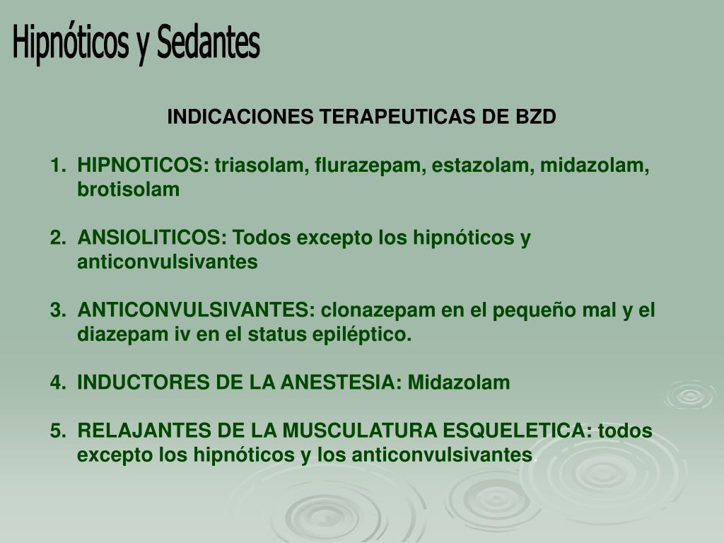 Hipnóticos y Sedantes • INDICACIONES TERAPEUTICAS DE BZD • HIPNOTICOS: triasolam, flurazepam, estazolam, midazolam, brotisolam • ANSIOLITICOS: Todos excepto los hipnóticos y anticonvulsivantes • ANTICONVULSIVANTES: clonazepam en el pequeño mal y el diazepam iv en el status epiléptico. • INDUCTORES DE LA ANESTESIA: Midazolam • RELAJANTES DE LA MUSCULATURA ESQUELETICA: todos excepto los hipnóticos y los anticonvulsivantes.