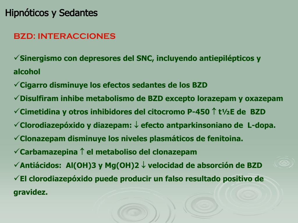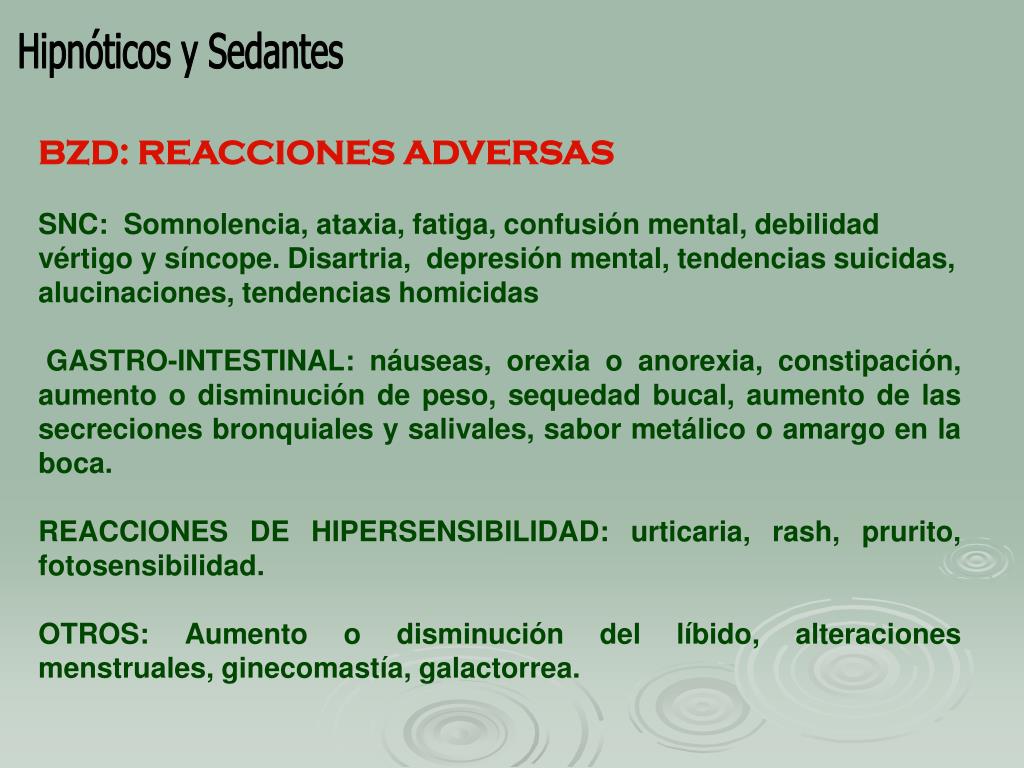 Hipnóticos y Sedantes BZD: REACCIONES ADVERSAS SNC: Somnolencia, ataxia, fatiga, confusión mental, debilidad vértigo y síncope. Disartria, depresión mental, tendencias suicidas, alucinaciones, tendencias homicidas GASTRO-INTESTINAL: náuseas, orexia o anorexia, constipación, aumento o disminución de peso, sequedad bucal, aumento de las secreciones bronquiales y salivales, sabor metálico o amargo en la boca. REACCIONES DE HIPERSENSIBILIDAD: urticaria, rash, prurito, fotosensibilidad. OTROS: Aumento o disminución del líbido, alteraciones menstruales, ginecomastía, galactorrea.