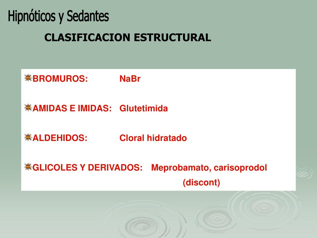 Hipnóticos y Sedantes CLASIFICACION ESTRUCTURAL • BROMUROS: NaBr • AMIDAS E IMIDAS: Glutetimida • ALDEHIDOS: Cloral hidratado • GLICOLES Y DERIVADOS: Meprobamato, carisoprodol (discont)