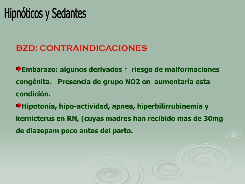 Hipnóticos y Sedantes • BZD: CONTRAINDICACIONES • Embarazo: algunos derivados ↑ riesgo de malformaciones congénita. Presencia de grupo NO2 en aumentaría esta condición. • Hipotonía, hipo-actividad, apnea, hiperbilirrubinemia y kernicterus en RN, (cuyas madres han recibido mas de 30mg de diazepam poco antes del parto.