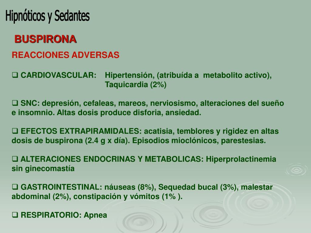 Hipnóticos y Sedantes BUSPIRONA • REACCIONES ADVERSAS • CARDIOVASCULAR: Hipertensión, (atribuída a metabolito activo), Taquicardia (2%) • SNC: depresión, cefaleas, mareos, nerviosismo, alteraciones del sueño e insomnio. Altas dosis produce disforia, ansiedad. • EFECTOS EXTRAPIRAMIDALES: acatisia, temblores y rigidez en altas dosis de buspirona (2.4 g x día). Episodios mioclónicos, parestesias. • ALTERACIONES ENDOCRINAS Y METABOLICAS: Hiperprolactinemia sin ginecomastía • GASTROINTESTINAL: náuseas (8%), Sequedad bucal (3%), malestar abdominal (2%), constipación y vómitos (1% ). • RESPIRATORIO: Apnea