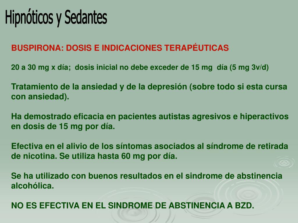 Hipnóticos y Sedantes BUSPIRONA: DOSIS E INDICACIONES TERAPÉUTICAS 20 a 30 mg x día; dosis inicial no debe exceder de 15 mg día (5 mg 3v/d) Tratamiento de la ansiedad y de la depresión (sobre todo si esta cursa con ansiedad). Ha demostrado eficacia en pacientes autistas agresivos e hiperactivos en dosis de 15 mg por día. Efectiva en el alivio de los síntomas asociados al síndrome de retirada de nicotina. Se utiliza hasta 60 mg por día. Se ha utilizado con buenos resultados en el sindrome de abstinencia alcohólica. NO ES EFECTIVA EN EL SINDROME DE ABSTINENCIA A BZD.