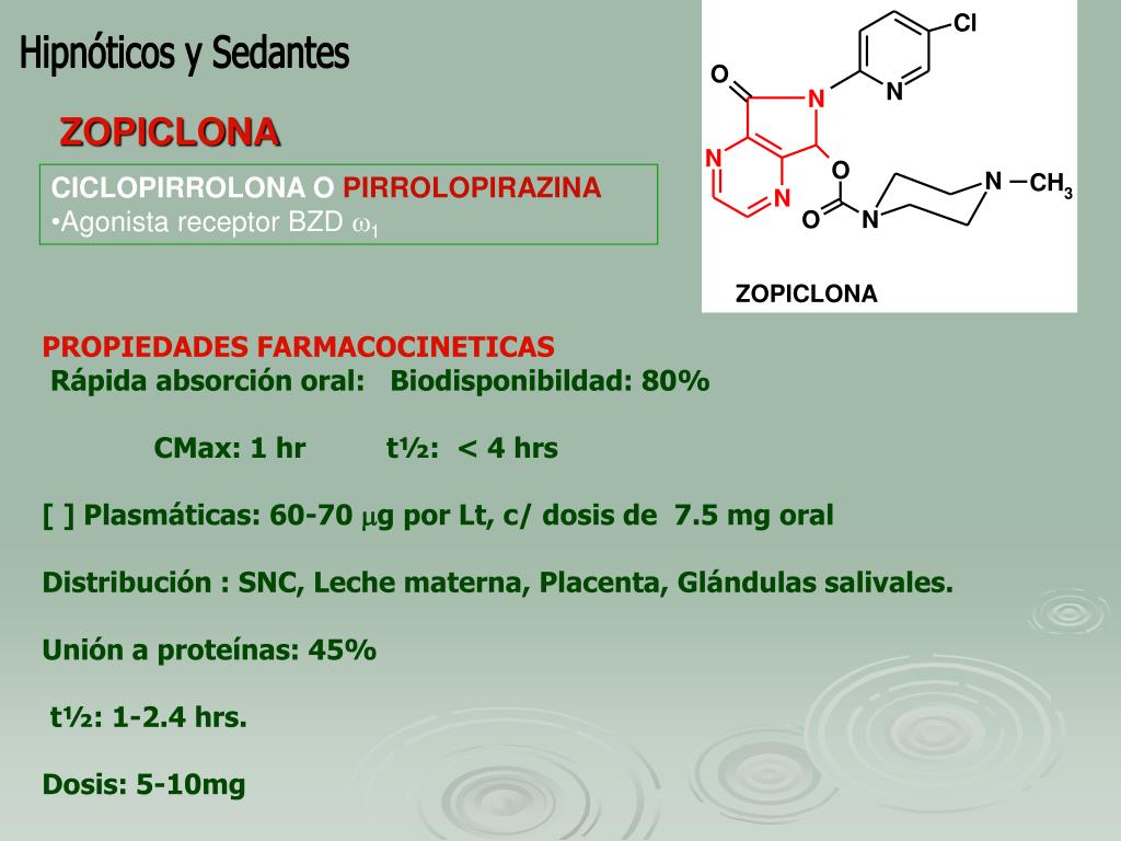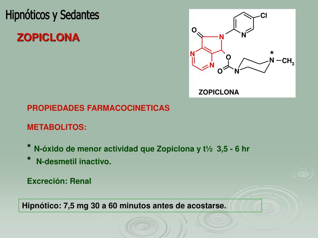 Hipnóticos y Sedantes ZOPICLONA * PROPIEDADES FARMACOCINETICAS METABOLITOS: *N-óxido de menor actividad que Zopiclona y t½ 3,5 - 6 hr * N-desmetil inactivo. Excreción: Renal Hipnótico:7,5 mg 30 a 60 minutos antes de acostarse.