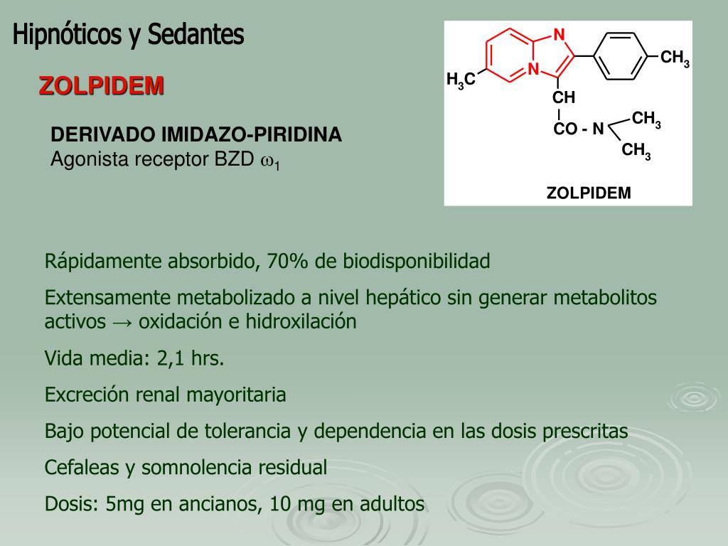 Hipnóticos y Sedantes ZOLPIDEM DERIVADO IMIDAZO-PIRIDINA Agonista receptor BZD 1 Rápidamente absorbido, 70% de biodisponibilidad Extensamente metabolizado a nivel hepático sin generar metabolitos activos → oxidación e hidroxilación Vida media: 2,1 hrs. Excreción renal mayoritaria Bajo potencial de tolerancia y dependencia en las dosis prescritas Cefaleas y somnolencia residual Dosis: 5mg en ancianos, 10 mg en adultos