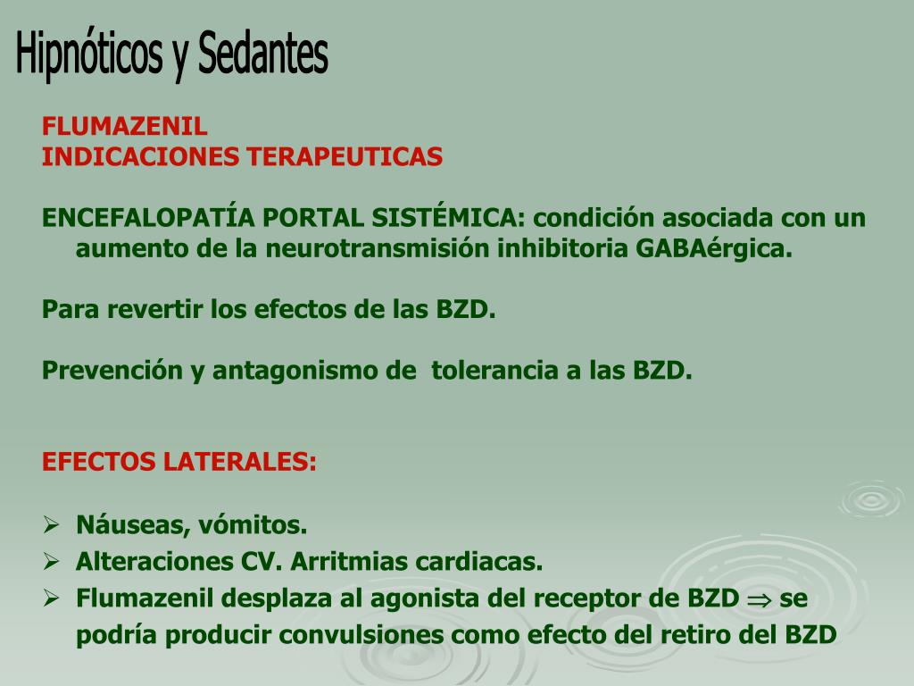 Hipnóticos y Sedantes • FLUMAZENIL • INDICACIONES TERAPEUTICAS • ENCEFALOPATÍA PORTAL SISTÉMICA: condición asociada con un aumento de la neurotransmisión inhibitoria GABAérgica. • Para revertir los efectos de las BZD. • Prevención y antagonismo de tolerancia a las BZD. • EFECTOS LATERALES: • Náuseas, vómitos. • Alteraciones CV. Arritmias cardiacas. • Flumazenil desplaza al agonista del receptor de BZD se podría producir convulsiones como efecto del retiro del BZD