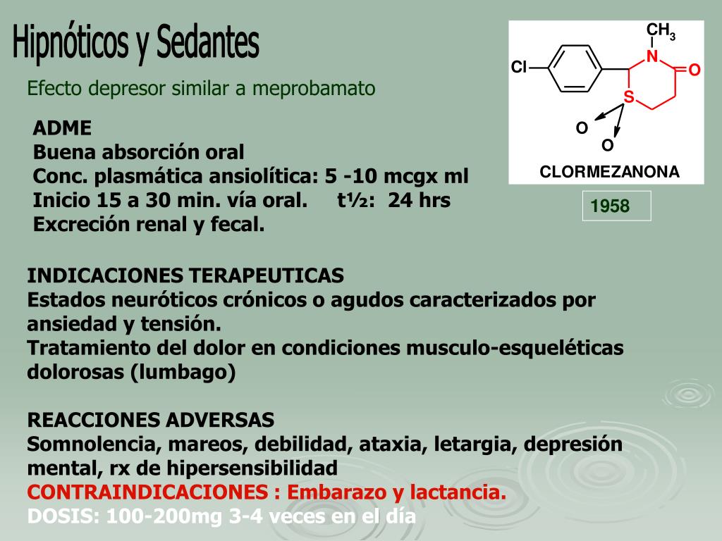 Hipnóticos y Sedantes Efecto depresor similar a meprobamato ADME Buena absorción oral Conc. plasmática ansiolítica: 5 -10 mcgx ml Inicio 15 a 30 min. vía oral. t½: 24 hrs Excreción renal y fecal. 1958 INDICACIONES TERAPEUTICAS Estados neuróticos crónicos o agudos caracterizados por ansiedad y tensión. Tratamiento del dolor en condiciones musculo-esqueléticas dolorosas (lumbago) REACCIONES ADVERSAS Somnolencia, mareos, debilidad, ataxia, letargia, depresión mental, rx de hipersensibilidad CONTRAINDICACIONES :Embarazo y lactancia. DOSIS: 100-200mg 3-4 veces en el día