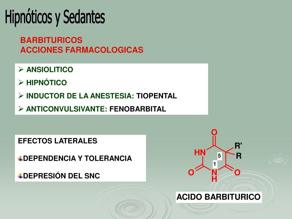 Hipnóticos y Sedantes BARBITURICOS ACCIONES FARMACOLOGICAS • ANSIOLITICO • HIPNÓTICO • INDUCTOR DE LA ANESTESIA: TIOPENTAL • ANTICONVULSIVANTE: FENOBARBITAL • EFECTOS LATERALES • DEPENDENCIA Y TOLERANCIA • DEPRESIÓN DEL SNC