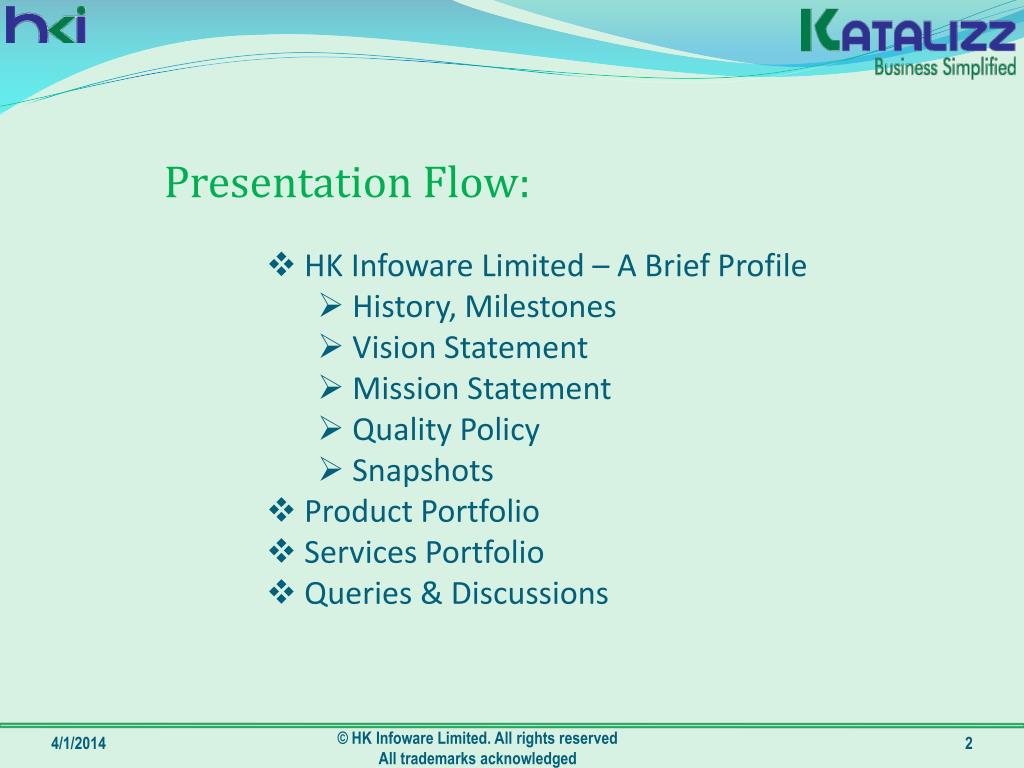 Presentation Flow: • HK Infoware Limited – A Brief Profile • History, Milestones • Vision Statement • Mission Statement • Quality Policy • Snapshots • Product Portfolio • Services Portfolio • Queries & Discussions © HK Infoware Limited. All rights reserved All trademarks acknowledged