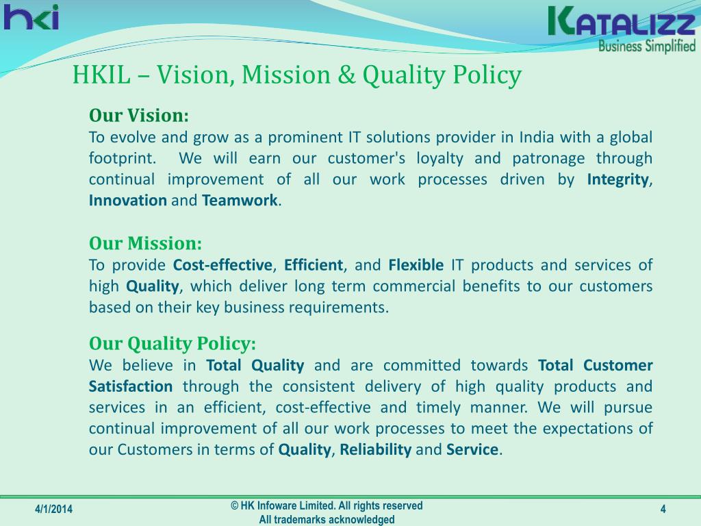 HKIL – Vision, Mission & Quality Policy Our Vision: To evolve and grow as a prominent IT solutions provider in India with a global footprint. We will earn our customer's loyalty and patronage through continual improvement of all our work processes driven by Integrity, Innovation and Teamwork. Our Mission: To provide Cost-effective, Efficient, and Flexible IT products and services of high Quality, which deliver long term commercial benefits to our customers based on their key business requirements. Our Quality Policy: We believe in Total Quality and are committed towards Total Customer Satisfaction through the consistent delivery of high quality products and services in an efficient, cost-effective and timely manner. We will pursue continual improvement of all our work processes to meet the expectations of our Customers in terms of Quality, Reliability and Service. © HK Infoware Limited. All rights reserved All trademarks acknowledged