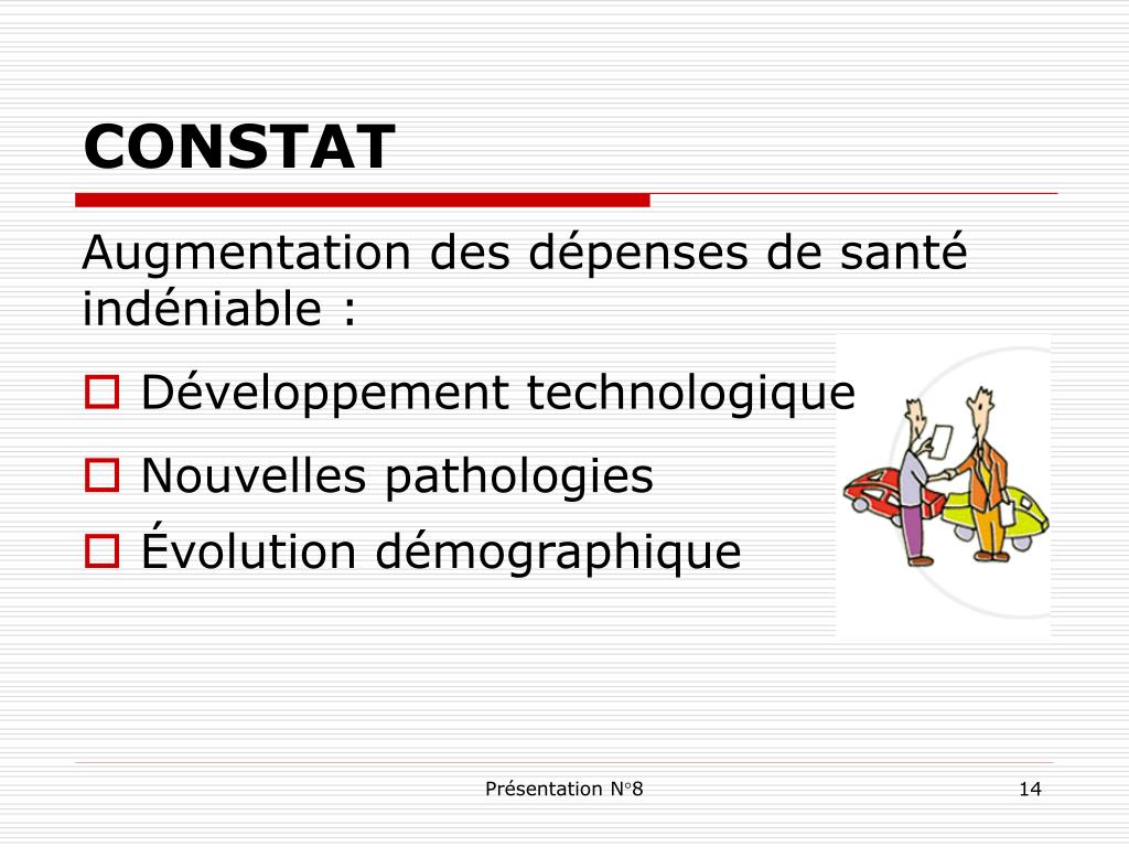 CONSTAT Augmentation des dépenses de santé indéniable : • Développement technologique • Nouvelles pathologies • Évolution démographique Présentation N°8