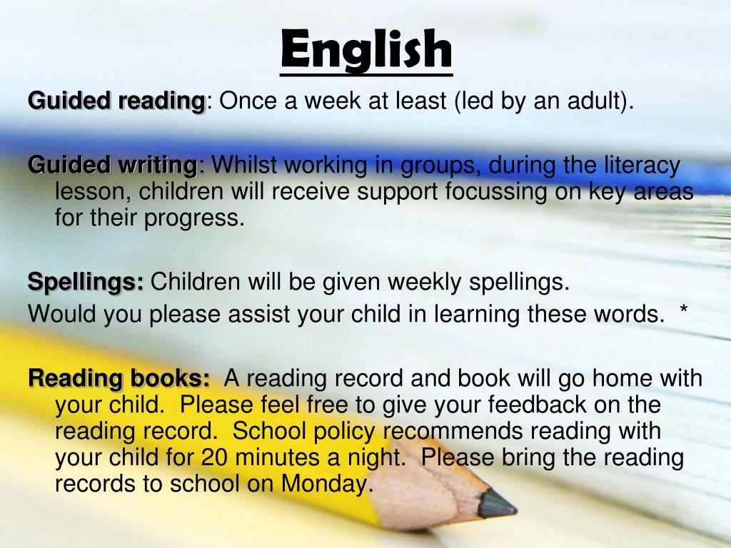 English Guided reading: Once a week at least (led by an adult). Guided writing: Whilst working in groups, during the literacy lesson, children will receive support focussing on key areas for their progress. Spellings: Children will be given weekly spellings. Would you please assist your child in learning these words. * Reading books: A reading record and book will go home with your child. Please feel free to give your feedback on the reading record. School policy recommends reading with your child for 20 minutes a night. Please bring the reading records to school on Monday.
