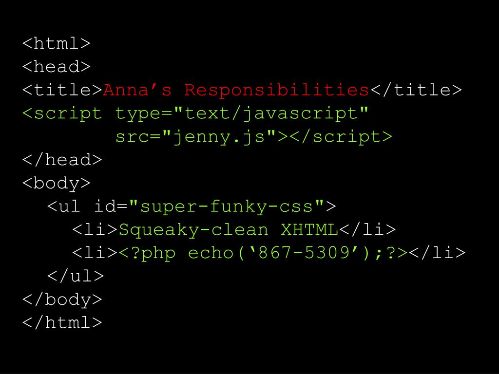 <html> • <head> • <title>Anna’s Responsibilities</title> • <script type="text/javascript" • src="jenny.js"></script> • </head> • <body> • <ul id="super-funky-css"> • <li>Squeaky-clean XHTML</li> • <li><?php echo(‘867-5309’);?></li> • </ul> • </body> • </html>