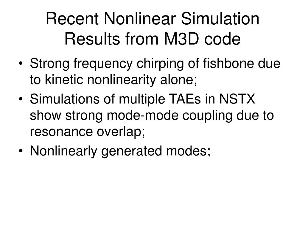 Recent Nonlinear Simulation Results from M3D code • Strong frequency chirping of fishbone due to kinetic nonlinearity alone; • Simulations of multiple TAEs in NSTX show strong mode-mode coupling due to resonance overlap; • Nonlinearly generated modes;