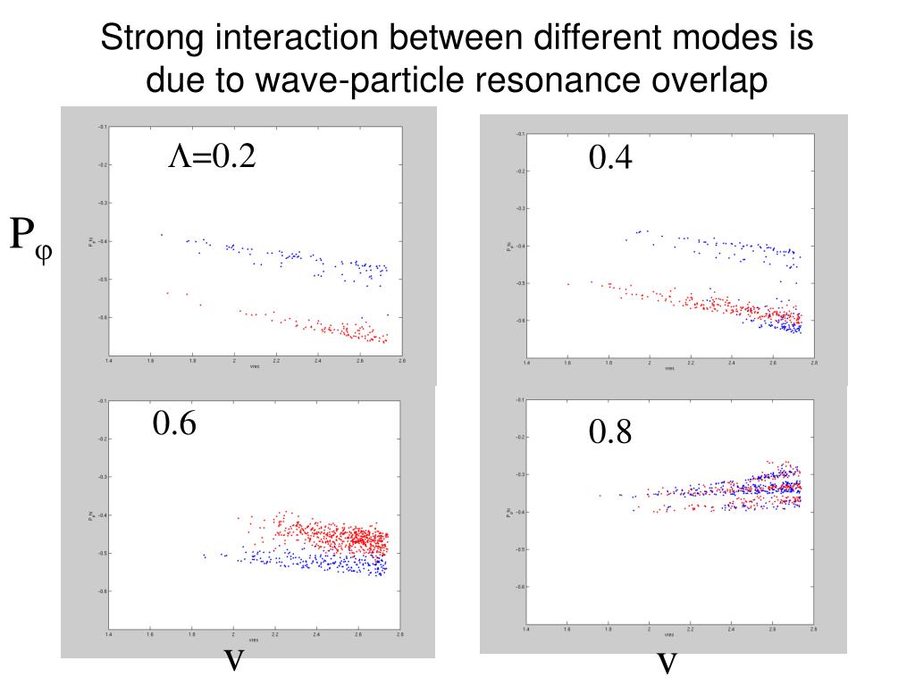 Strong interaction between different modes is due to wave-particle resonance overlap L=0.2 0.4 Pj 0.6 0.8 v v