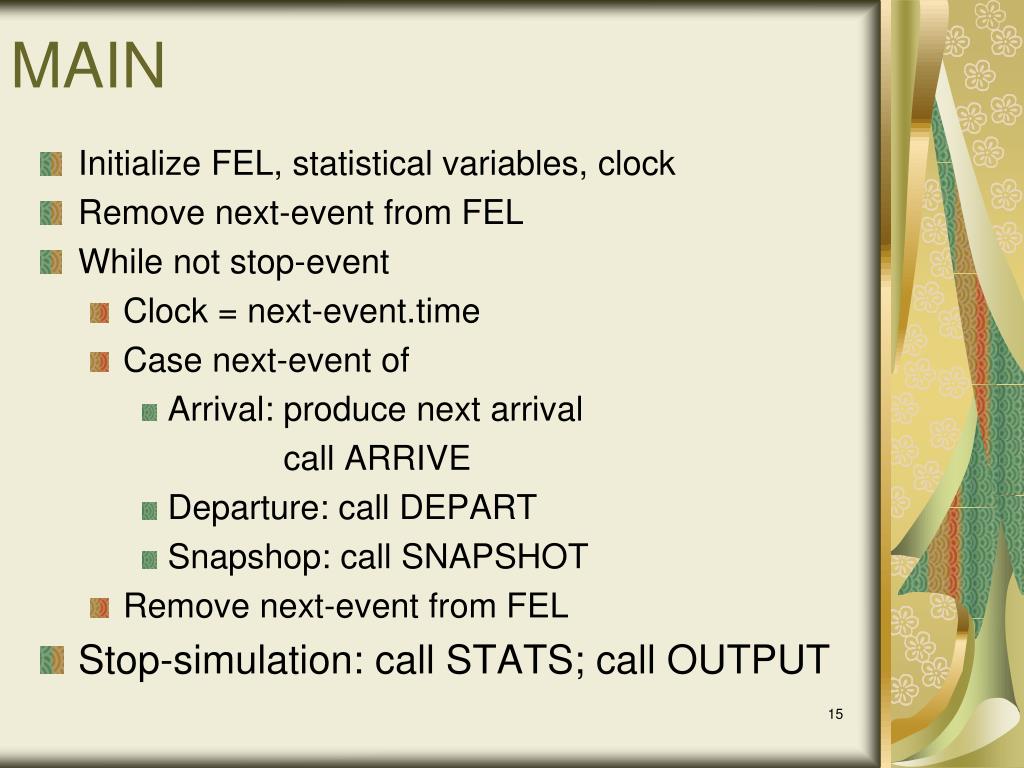 MAIN • Initialize FEL, statistical variables, clock • Remove next-event from FEL • While not stop-event • Clock = next-event.time • Case next-event of • Arrival: produce next arrival call ARRIVE • Departure: call DEPART • Snapshop: call SNAPSHOT • Remove next-event from FEL • Stop-simulation: call STATS; call OUTPUT