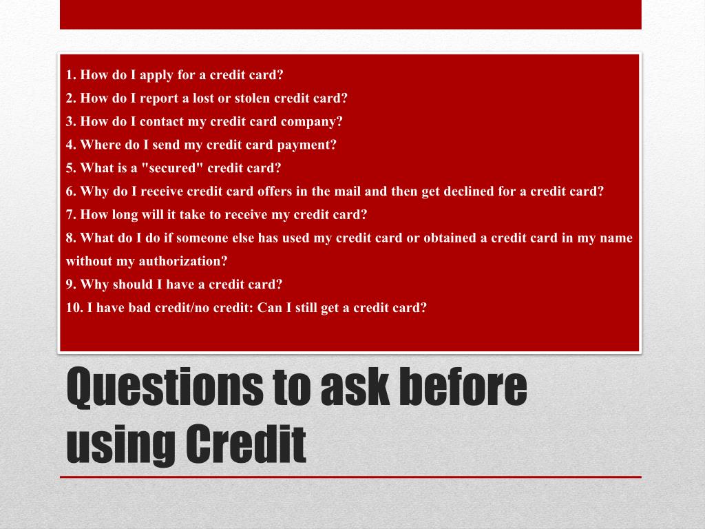 1. How do I apply for a credit card?2. How do I report a lost or stolen credit card?3. How do I contact my credit card company?4. Where do I send my credit card payment?5. What is a "secured" credit card?6. Why do I receive credit card offers in the mail and then get declined for a credit card?7. How long will it take to receive my credit card?8. What do I do if someone else has used my credit card or obtained a credit card in my name without my authorization?9. Why should I have a credit card?10. I have bad credit/no credit: Can I still get a credit card? Questions to ask before using Credit