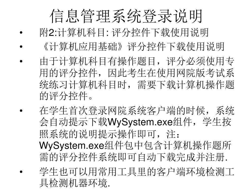 信息管理系统登录说明 附2:计算机科目: 评分控件下载使用说明 《计算机应用基础》评分控件下载使用说明 由于计算机科目有操作题目,评分必须使用专用的评分控件,因此考生在使用网院版考试系统练习计算机科目时,需要下载计算机操作题的评分控件。 在学生首次登录网院系统客户端的时候,系统会自动提示下载WySystem.exe组件,学生按照系统的说明提示操作即可,注:WySystem.exe组件包中包含计算机操作题所需的评分控件系统即可自动下载完成并注册. 学生也可以用常用工具里的客户端环境检测工具检测机器环境.