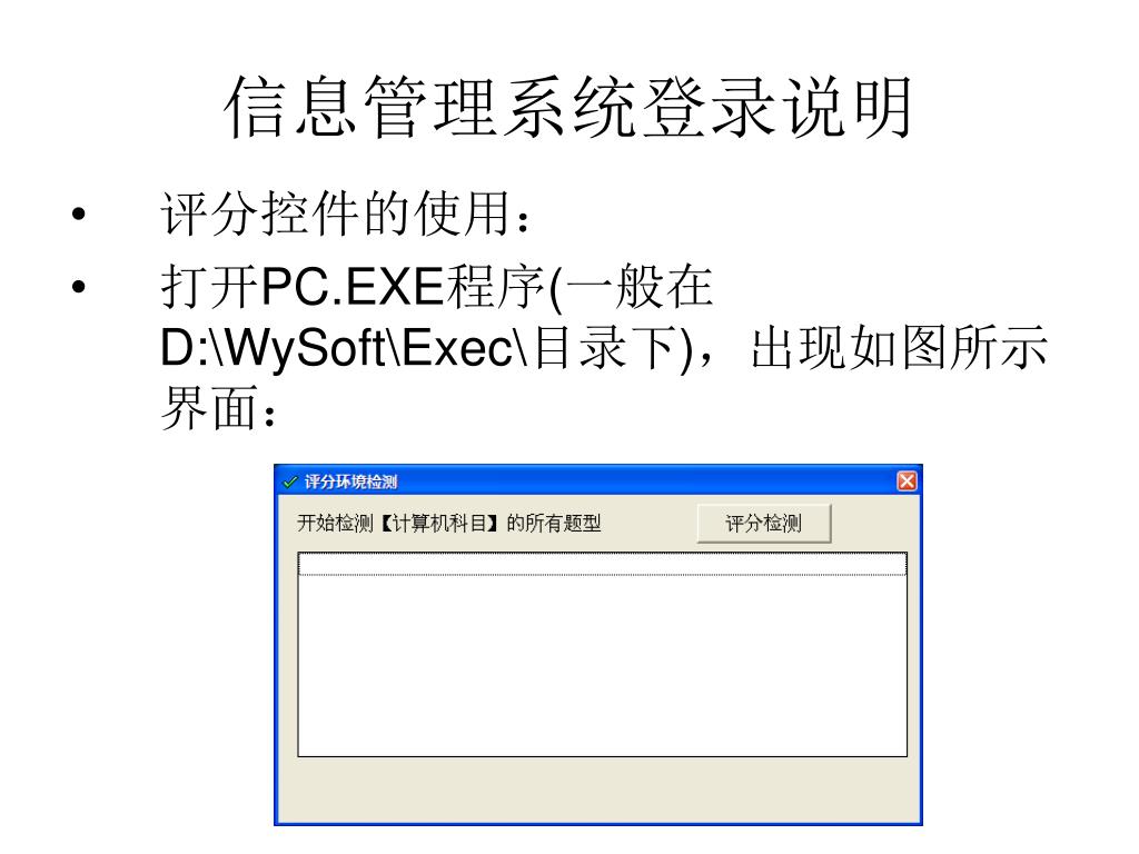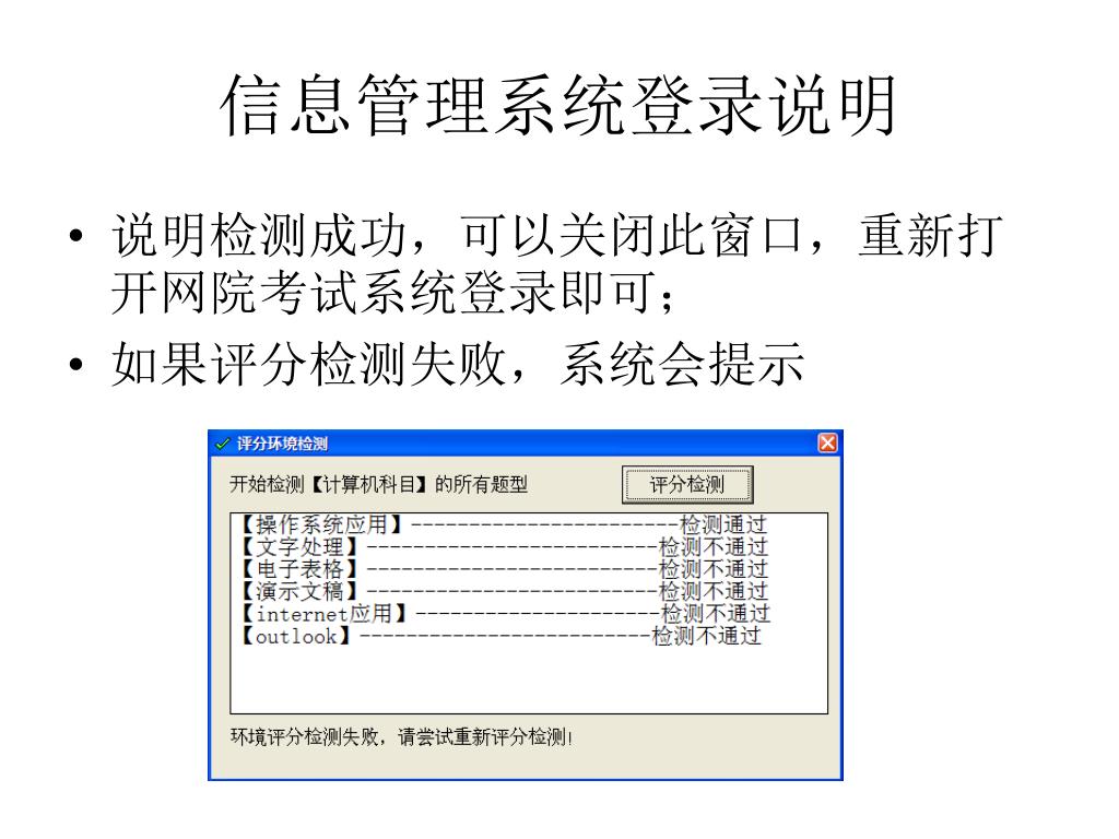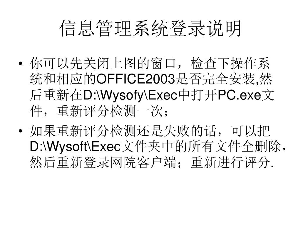 信息管理系统登录说明 你可以先关闭上图的窗口,检查下操作系统和相应的OFFICE2003是否完全安装,然后重新在D:\Wysofy\Exec中打开PC.exe文件,重新评分检测一次; 如果重新评分检测还是失败的话,可以把D:\Wysoft\Exec文件夹中的所有文件全删除,然后重新登录网院客户端;重新进行评分.