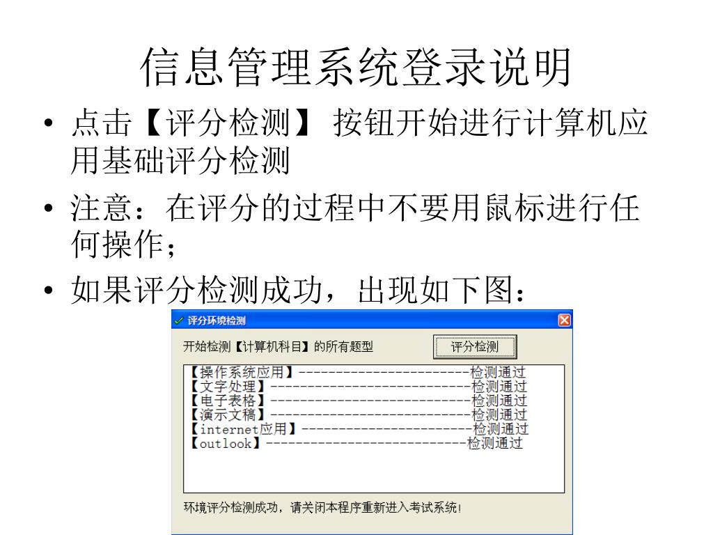 信息管理系统登录说明 点击【评分检测】 按钮开始进行计算机应用基础评分检测 注意:在评分的过程中不要用鼠标进行任何操作; 如果评分检测成功,出现如下图: