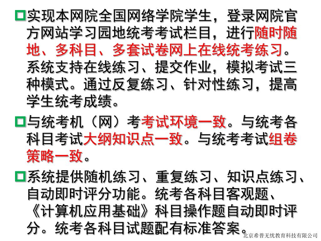实现本网院全国网络学院学生,登录网院官方网站学习园地统考考试栏目,进行随时随地、多科目、多套试卷网上在线统考练习。系统支持在线练习、提交作业,模拟考试三种模式。通过反复练习、针对性练习,提高学生统考成绩。实现本网院全国网络学院学生,登录网院官方网站学习园地统考考试栏目,进行随时随地、多科目、多套试卷网上在线统考练习。系统支持在线练习、提交作业,模拟考试三种模式。通过反复练习、针对性练习,提高学生统考成绩。 • 与统考机(网)考考试环境一致。与统考各科目考试大纲知识点一致。与统考考试组卷策略一致。 • 系统提供随机练习、重复练习、知识点练习、自动即时评分功能。统考各科目客观题、《计算机应用基础》科目操作题自动即时评分。统考各科目试题配有标准答案。 3 北京希普无忧教育科技有限公司