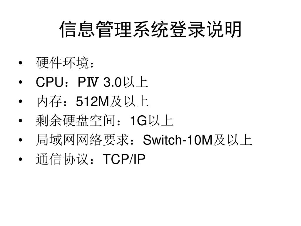 信息管理系统登录说明 硬件环境: CPU:PⅣ 3.0以上 内存:512M及以上 剩余硬盘空间:1G以上 局域网网络要求:Switch-10M及以上 通信协议:TCP/IP