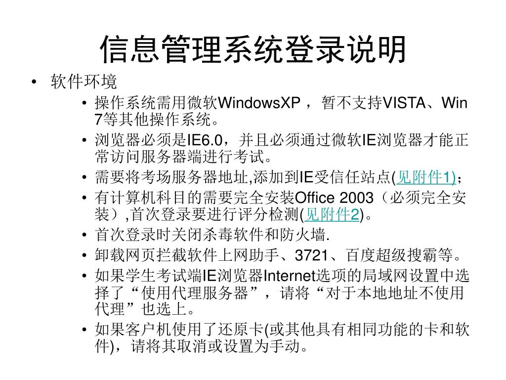 信息管理系统登录说明 软件环境 操作系统需用微软WindowsXP ,暂不支持VISTA、Win 7等其他操作系统。 浏览器必须是IE6.0,并且必须通过微软IE浏览器才能正常访问服务器端进行考试。 需要将考场服务器地址,添加到IE受信任站点(见附件1); 有计算机科目的需要完全安装Office 2003(必须完全安装),首次登录要进行评分检测(见附件2)。 首次登录时关闭杀毒软件和防火墙. 卸载网页拦截软件上网助手、3721、百度超级搜霸等。 如果学生考试端IE浏览器Internet选项的局域网设置中选择了“使用代理服务器”,请将“对于本地地址不使用代理”也选上。 如果客户机使用了还原卡(或其他具有相同功能的卡和软件),请将其取消或设置为手动。