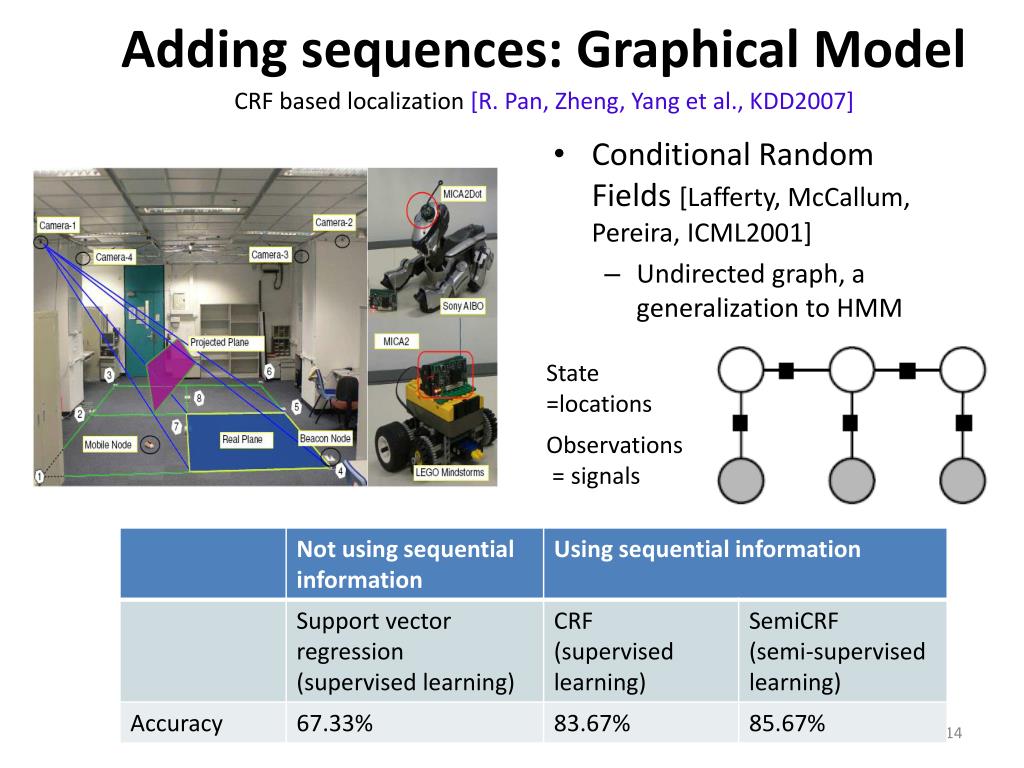 Adding sequences: Graphical Model CRF based localization [R. Pan, Zheng, Yang et al., KDD2007] • Conditional Random Fields [Lafferty, McCallum, Pereira, ICML2001] • Undirected graph, a generalization to HMM State =locations Observations = signals