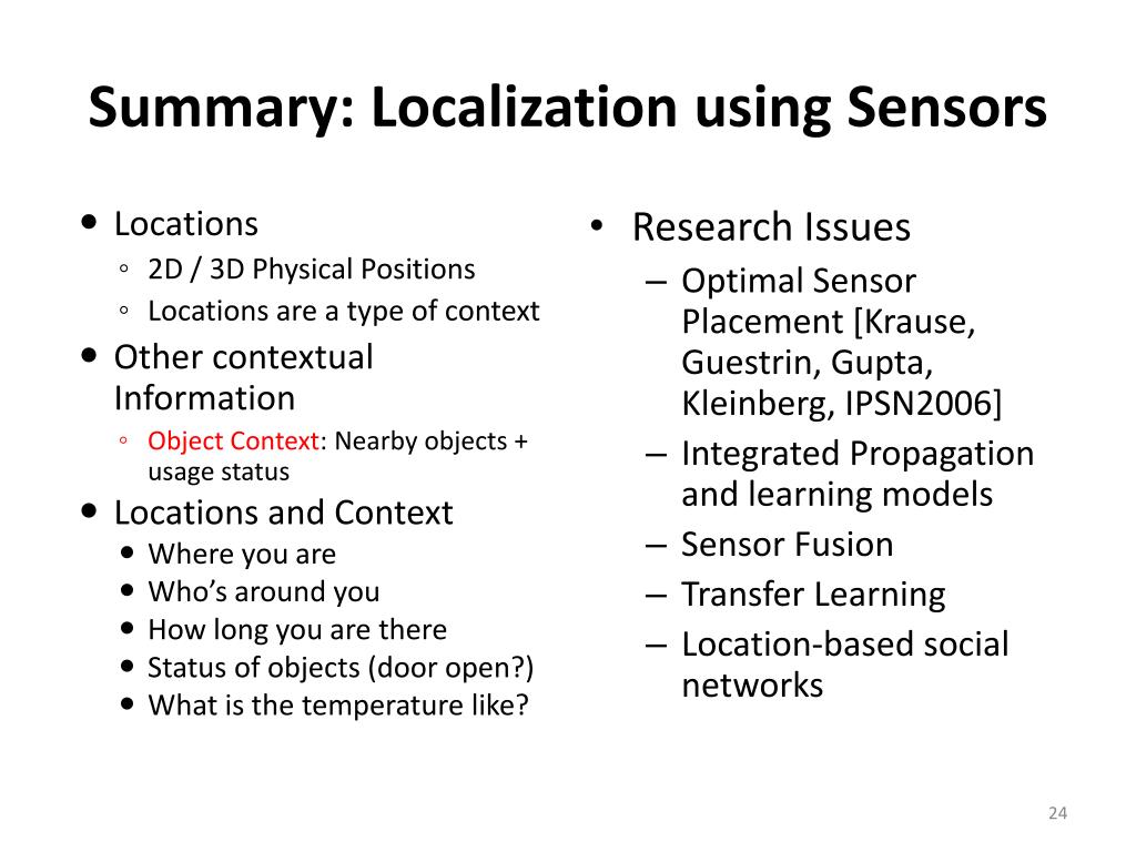 Summary: Localization using Sensors • Research Issues • Optimal Sensor Placement [Krause, Guestrin, Gupta, Kleinberg, IPSN2006] • Integrated Propagation and learning models • Sensor Fusion • Transfer Learning • Location-based social networks • Locations • 2D / 3D Physical Positions • Locations are a type of context • Other contextual Information • Object Context: Nearby objects + usage status • Locations and Context • Where you are • Who’s around you • How long you are there • Status of objects (door open?) • What is the temperature like?