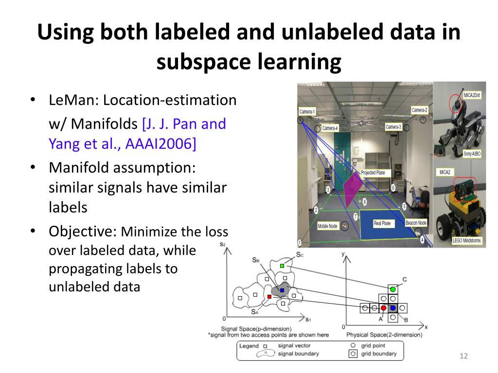 Using both labeled and unlabeled data in subspace learning • LeMan: Location-estimation w/ Manifolds [J. J. Pan and Yang et al., AAAI2006] • Manifold assumption: similar signals have similar labels • Objective: Minimize the loss over labeled data, whilepropagating labels to unlabeled data