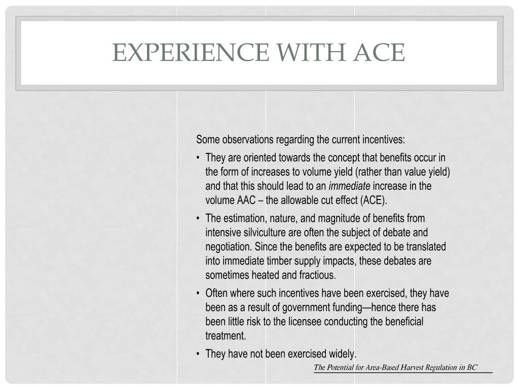 Allowable Cut Effect (ACE) • The Allowable Cut Effect exists where there are regulations or policies that constrain harvest levels • Examples in BC are the metering out of old growth timber (key for it to work) • Improvements in growth and yield are spread out over the entire rotation • Conversely losses in timber are also spread out (regardless of whether or not timber was close to harvesting age)