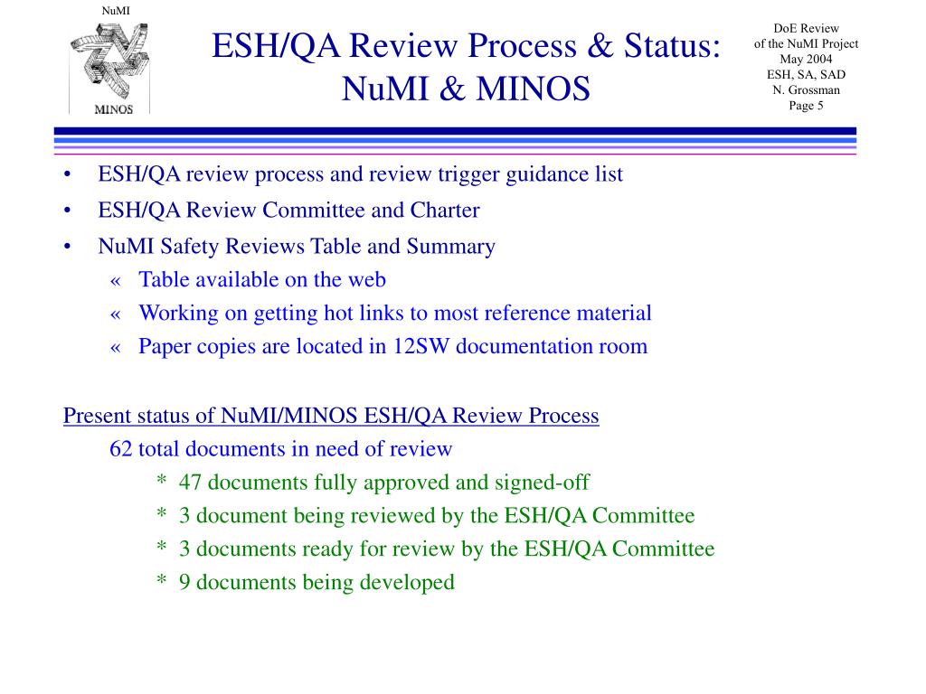 ESH/QA Review Process & Status:NuMI & MINOS • ESH/QA review process and review trigger guidance list • ESH/QA Review Committee and Charter • NuMI Safety Reviews Table and Summary • Table available on the web • Working on getting hot links to most reference material • Paper copies are located in 12SW documentation room Present status of NuMI/MINOS ESH/QA Review Process 62 total documents in need of review • 47 documents fully approved and signed-off • 3 document being reviewed by the ESH/QA Committee • 3 documents ready for review by the ESH/QA Committee • 9 documents being developed