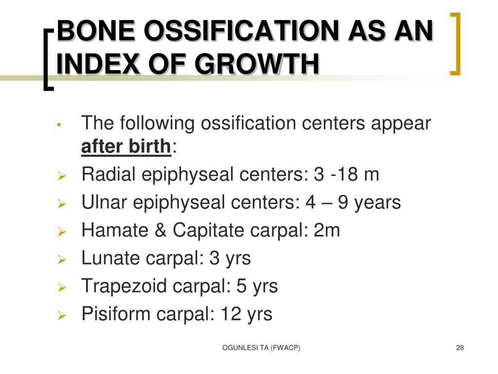 BONE OSSIFICATION AS AN INDEX OF GROWTH • The following ossification centers appear after birth: • Radial epiphyseal centers: 3 -18 m • Ulnar epiphyseal centers: 4 – 9 years • Hamate & Capitate carpal: 2m • Lunate carpal: 3 yrs • Trapezoid carpal: 5 yrs • Pisiform carpal: 12 yrs OGUNLESI TA (FWACP)