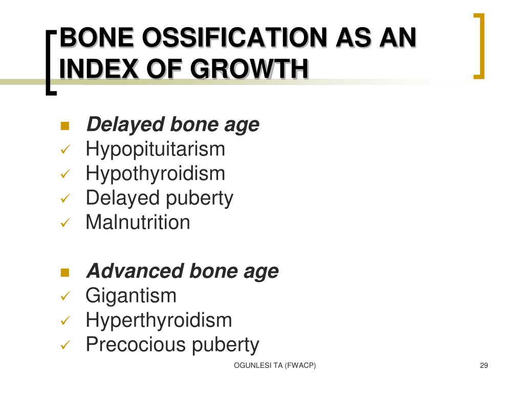 BONE OSSIFICATION AS AN INDEX OF GROWTH • Delayed bone age • Hypopituitarism • Hypothyroidism • Delayed puberty • Malnutrition • Advanced bone age • Gigantism • Hyperthyroidism • Precocious puberty OGUNLESI TA (FWACP)